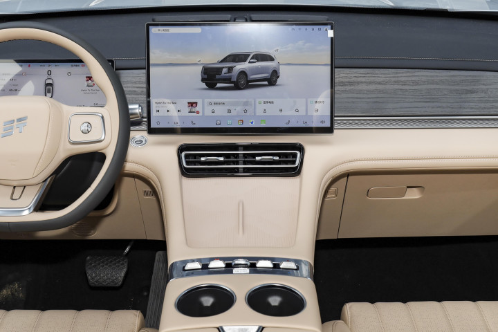 它标配了骁龙 8155 芯片,这是现在很多中高端车型都在用的芯片,所以车机运行起来特别流畅,切换界面、打开应用都没有卡顿。中控是一块 15.6 英寸的向日葵屏,能左右各偏转 10°,配合四音区语音控制,不管是主驾、副驾还是二排的乘客说话,屏幕都能智能转过去,操作起来很方便。